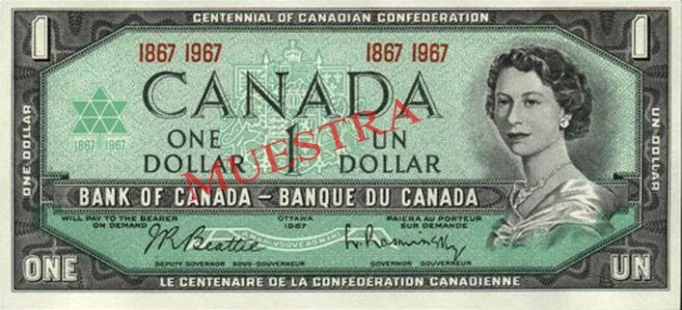 MOTIVOS PRINCIPALES: ANVERSO: La Reina Isabel II. DATOS PERSONALES DE: LA REINA ISABEL II. Durante sus 60 años de reinado (en la actualidad el segundo más largo de la historia británica), se ha convertido en la reina de veinticinco países de los cuales la mitad obtuvieron su independencia y se convirtieron en República. REVERSO: Edificios del Antiguo Parlamento. En honor a los 100 años de la Confederación, se emitió una versión modificada del billete de 1CAD en 1954, que lleva la fecha de 1967. El logotipo del Centenario está en el anverso y una vista de los edificios originales del Parlamento de Canadá, destruídos por un incendio en 1916, sustituyendo el paisaje de la pradera que aparecía en los billetes originales de 1954.