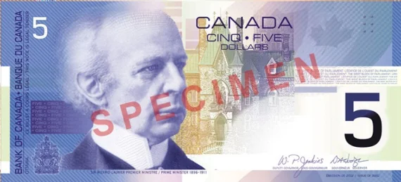 En las lineas diagonales a la izquierda del retrato aparece el microtexto "FIVE 5 CINQ" mientras que el texto a la derecha del edificio del Parlamento se reduce gradualmente pero se mantiene claro y bien definido.