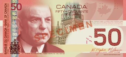 Fácil de determinar al tacto sobre el anverso del billete, específicamente sobre el número "50" de gran tamaño, el escudo de Armas y las palabras "BANK OF CANADA. BANQUE DU CANADA".