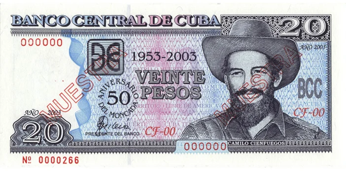 MOTIVOS PRINCIPALES: ANVERSO: Efigie de Camilo Cienfuegos Gorriarán a la derecha del billete. En el centro inferior izquierdo la leyenda en forma de círculo "ANIVERSARIO 50 DEL MONCADA" y encima de la denominación en letras la inscripción conmemorativa: "1953-2003". DATOS PERSONALES DE: CAMILO CIENFUEGOS GORRIARÁN. (1932-1959) Combatiente y revolucionario cubano. Expedicionario del Yate Granma. Uno de los pilares fundamentales de la gesta armada que derrocó a la tiranía pro imperialista del dictador Fulgencio Batista el 1 de enero de 1959. Amigo inseparable de Ernesto Che Guevara. Su valor hizo que el pueblo espontáneamente le otorgara el título honorífico de Héroe de Yaguajay y Señor de la Vanguardia. REVERSO: Escena del ASALTO AL CUARTEL MONCADA.